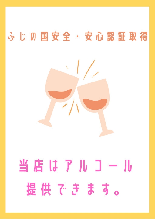静岡県に発令されるまん延防止措置に対して、当店はふじの国安全・安心認証を取得しておりますので、アルコール提供できますので是非ご来店ください。